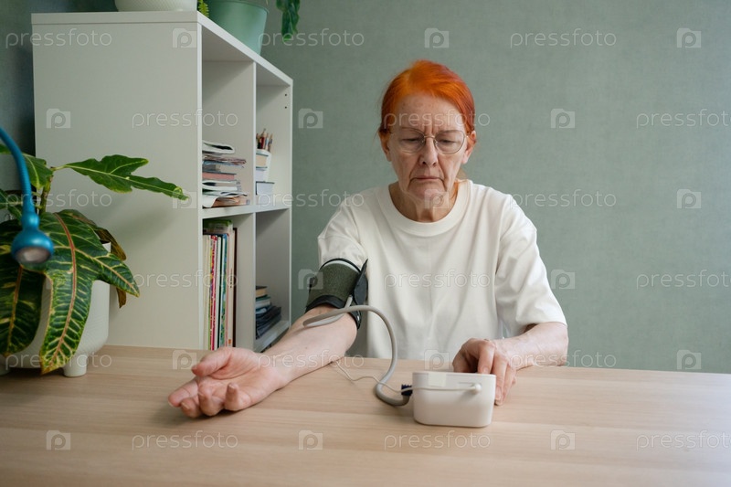 Пожилая женщина контролирует свое артериальное давление с помощью цифрового устройства, сидя за домашним столом прямо перед камерой
