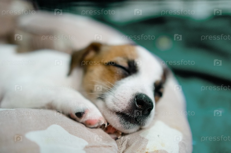 Мирное щенко, удобно дремлющее в мягкой теплой кровати
