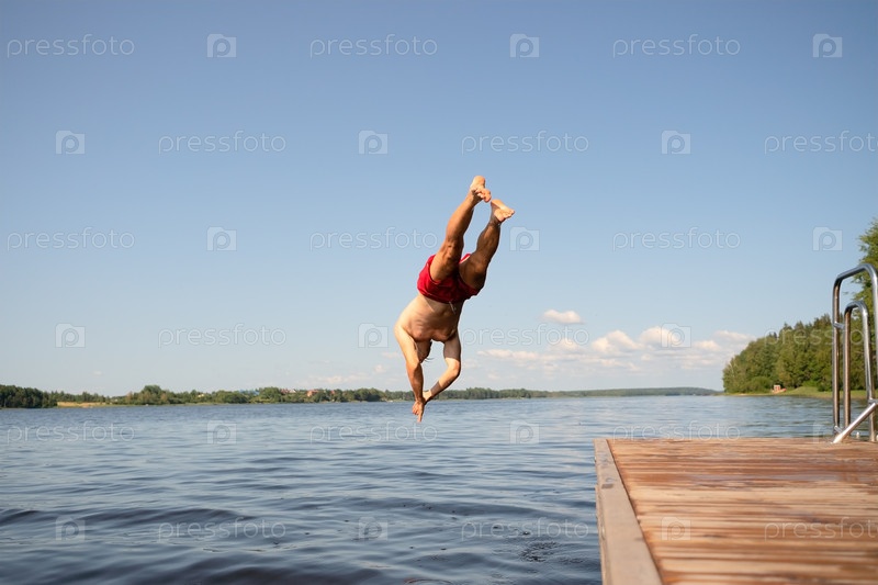 Мужчина ныряет головой с пирса в озеро - сильная форма, чистая вода, летний момент