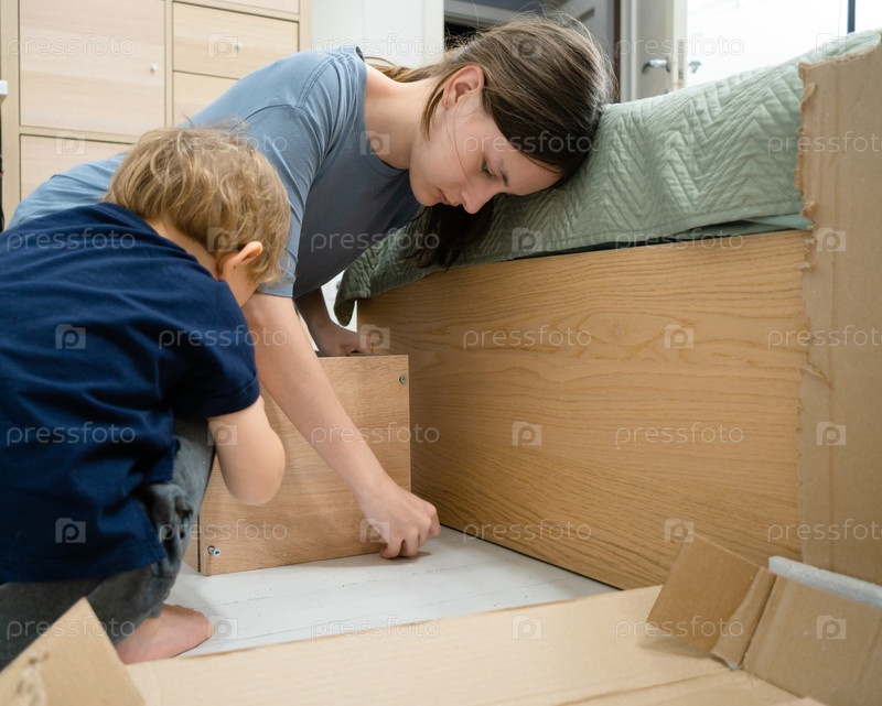 Маленький мальчик активно помогает своей сестре-подростку во время сборки новой плоской книжной шкафы