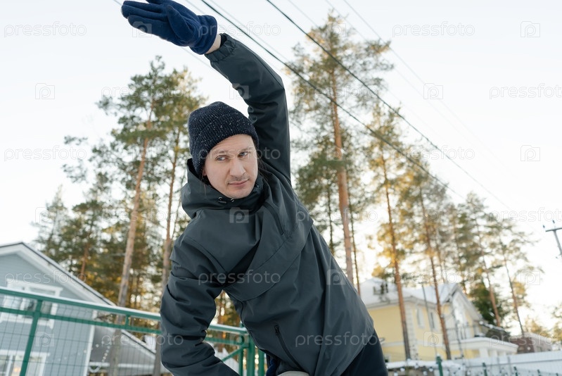 Ближайший снимок сорокалетнего мужчины, делающего боковой изгиб с одной поднятой рукой на открытом воздухе