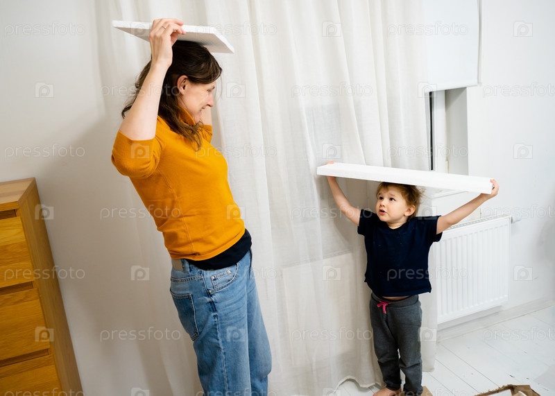 Веселая мать и ее маленький ребенок развлекаются, собирая шкаф. они держат над головой большую деревянную доску из мебельного набора, притворившись, что это крыша детского дома