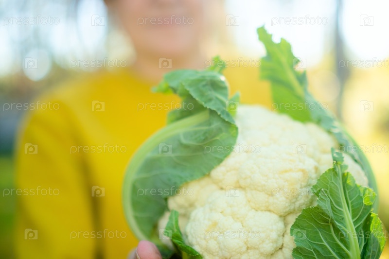 Ближайшее изображение женщины-фермера, держащей голову цветной капусты в сезон осеннего сбора урожая.Органические овощи, здоровая пища, натуральное сельское хозяйство и богатая клетчаткой диета, местные продукты, выращенные с осторожностью