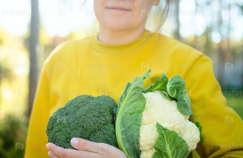 Веселая фермерка держит свежую капусту и брокколи в корзине