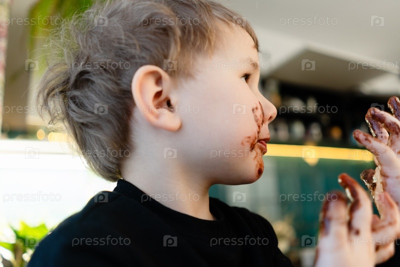 Вид со стороны Ребенок лижет шоколад с руки