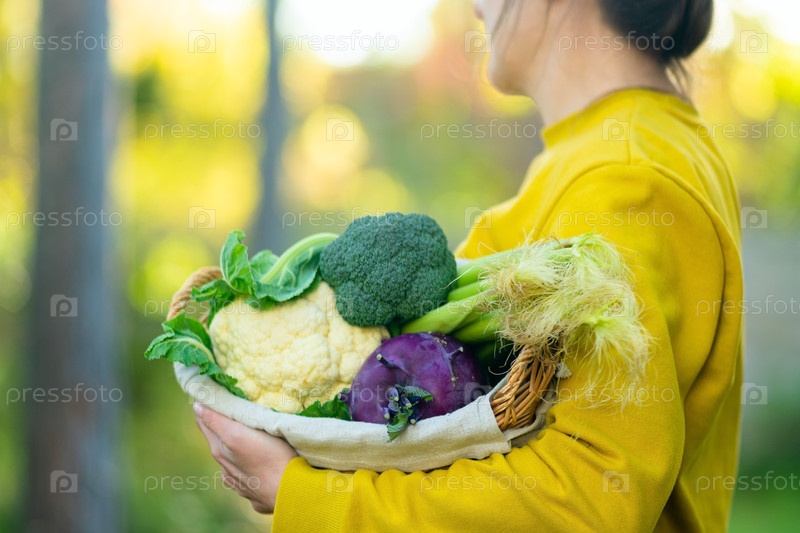 Ближайшее изображение женщины-фермера, держащей корзину с брокколи, цветной капустой, кохраби и молодой кукурузой.Осенний урожай, сельское хозяйство, свежие органические овощи, здоровое питание, клетчатки, питание и сельский образ жизни