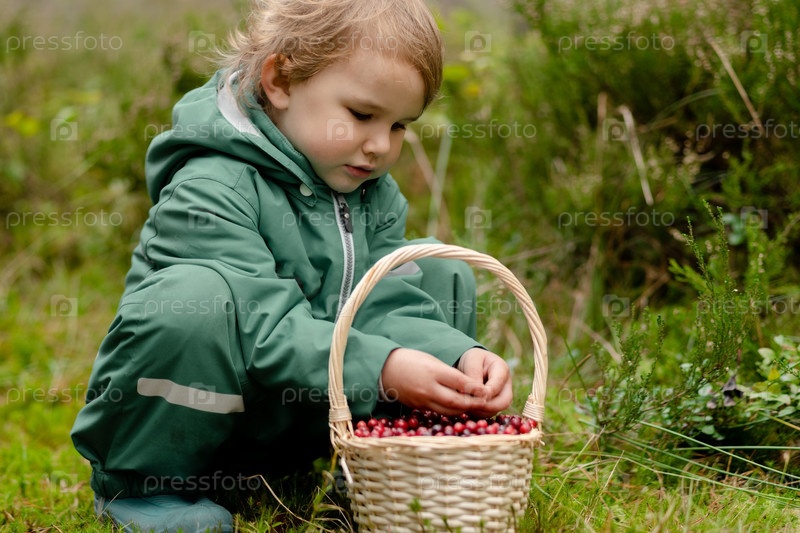 Мальчик сортирует клюквы в корзине, сидящий в лесу