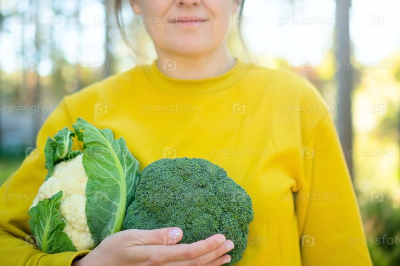 Счастливая женщина-фермер с корзиной из цветной капусты и брокколи