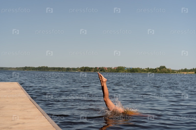 Спортсменка в купальнике ныряет головой с пирса в озеро.Солнечный летний день, динамичное действие на свежем воздухе