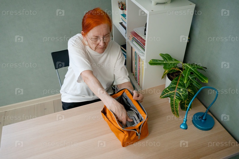 Пожилая женщина вытаскивает компактный монитор артериального давления из мешка или косметического пакета у своего домашнего стола