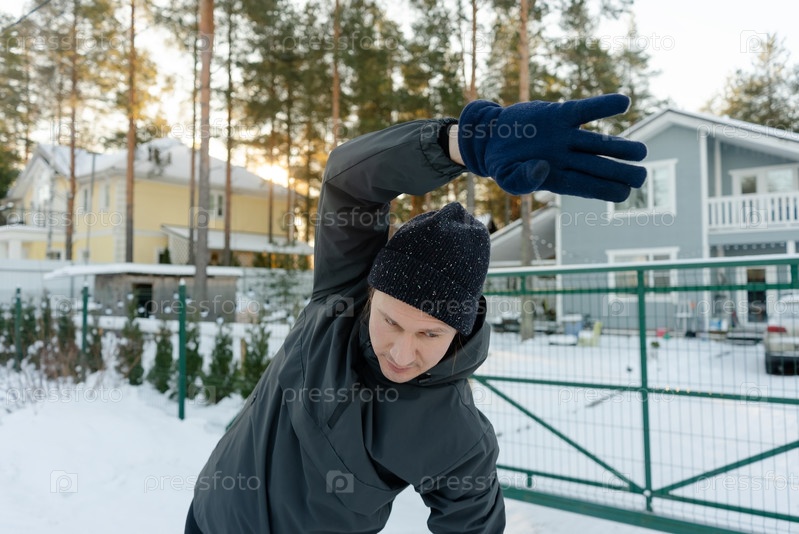 Мужчина средних лет делает боковые изгибы с поднятыми руками в любую погоду. он согревается на улице в холодный день, демонстрируя преданность фитнесу