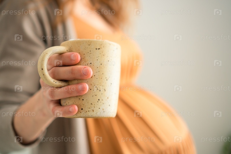 Будущая мама наслаждается теплым кофейным напитком в спокойной домашней обстановке.Обсуждение ответственного потребления кофеина во время беременности