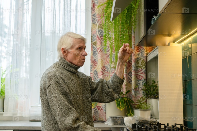 Пожилой мужчина тянется за предметами на полке, боковой вид