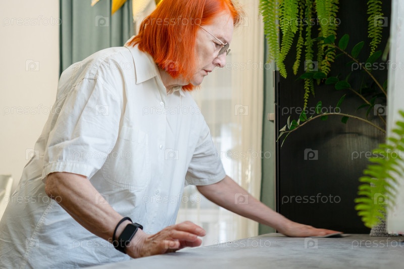 Пожилая женщина с ярко-красными волосами убирает свою кухню, стирая столешницу и выполняя эти повседневные дела самостоятельно, отражая ее автономию, грациозное старение и достоинство