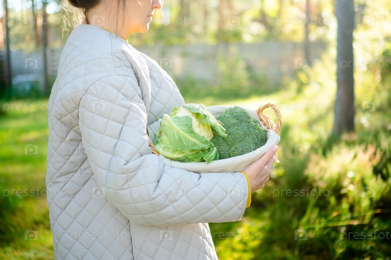 Боковой вид фермерки, держащей корзину с цветной капустой и брокколи