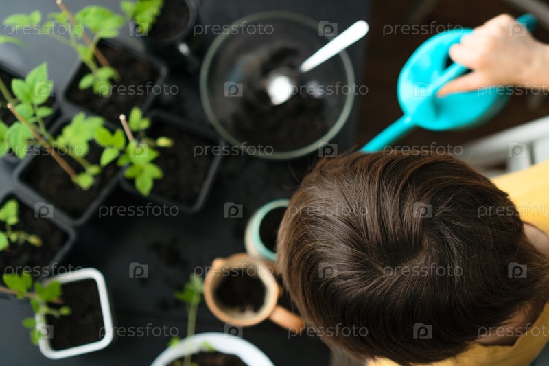 Маленький мальчик сажает саженцы дома. Независимый ребенок занят хобби с горшковыми растениями. Счастливый ребенок пересаживает помидоры. Концепция на всю жизнь. Вид сверху
