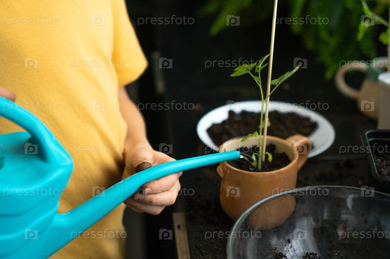 Маленький мальчик сажает саженцы дома. Независимый ребенок занят хобби, пересаживая растения, опрыскивая цветами. Концепция жизни