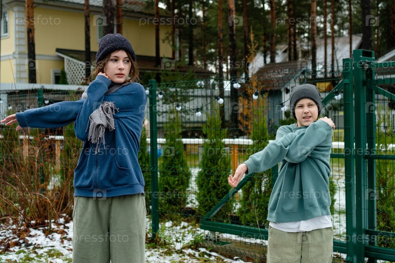 Мальчик и девочка-подросток стоят на улице, выполняя разминку плеч и рук перед началом бега.Эта подготовка имеет решающее значение для профилактики травм, демонстрируя ответственный подход к спорту