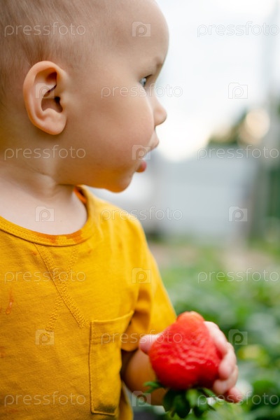 Боковой вид ребенка, держащего клубнику в руке