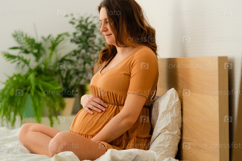 Мирная беременная женщина, сидящая на кровати и с любовью поглаживающая свой живот в теплой домашней обстановке