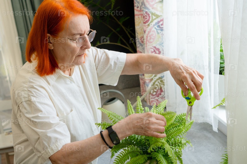 Живая 70-летняя женщина с ярко-красными волосами занимается своим хобби - уходом за комнатными растениями на подоконнике кухни
