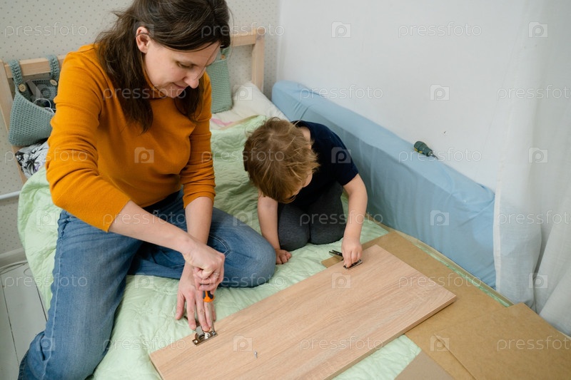 Мать и сын собирают шкаф с помощью отвертки