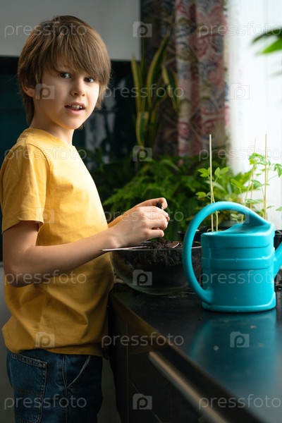 Маленький мальчик сажает саженцы дома. Независимый ребенок занят хобби с горшковыми растениями. Концепция на всю жизнь