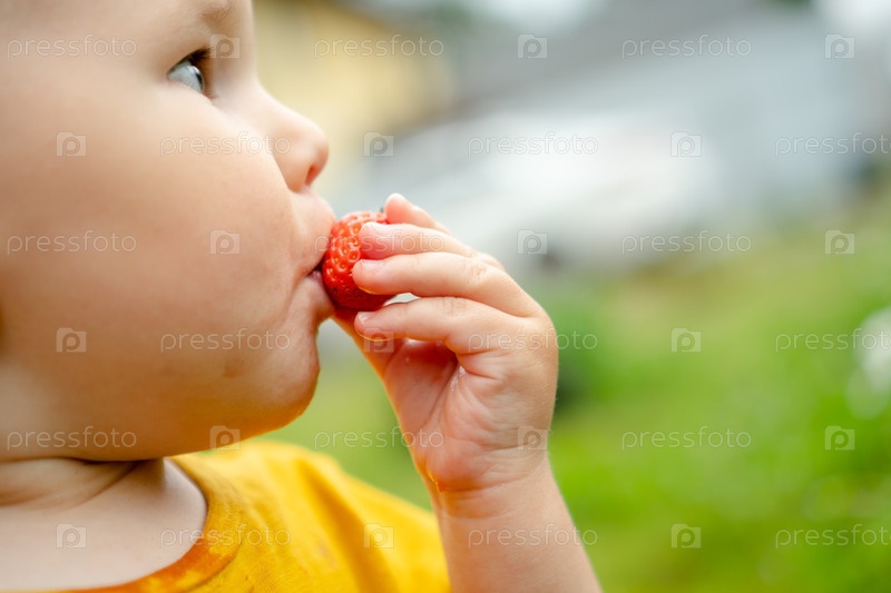 Профильный снимок ребенка, приносящего клубнику в рот