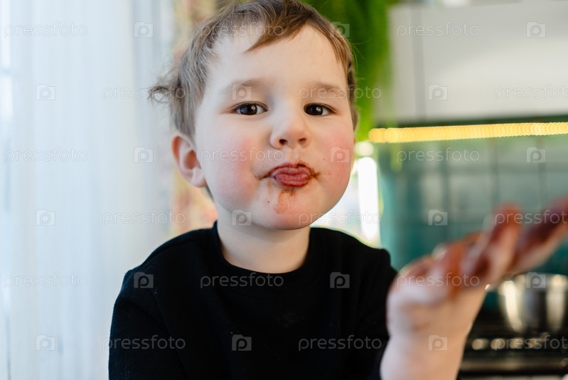 Радующийся трехлетний мальчик собирается лизать расплавленный шоколад с его рук. Счастливое выражение лица после кражи сладостей. Понятие детского ожирения, нездорового питания, аллергии и последствий диабета