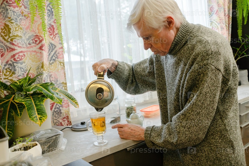 Пожилой мужчина наливает чай во время приятного завтрака, сосредоточившись на наслаждении едой.Изображение передает позитивность и простые удовольствия в повседневной жизни старшего человека.Содержание дедушки