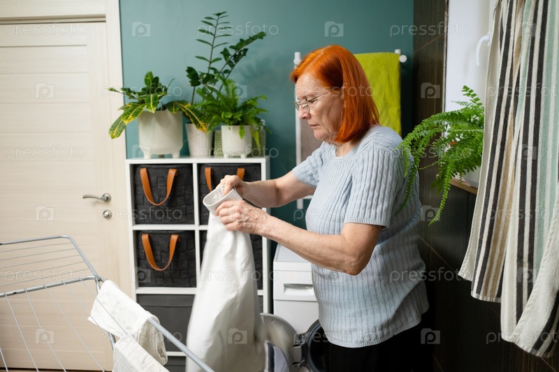 70-летняя женщина обращает пристальное внимание на воротник рубашки, проверяет его чистоту после прохождения через стиральную машину
