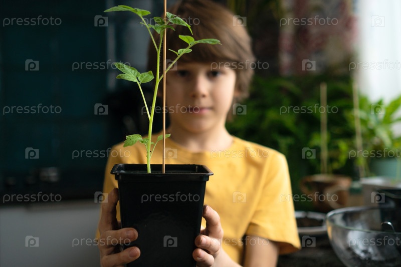 Маленький мальчик сажает саженцы дома. Независимый ребенок занят хобби, пересаживая растения, поливая цветами. концепция на всю жизнь