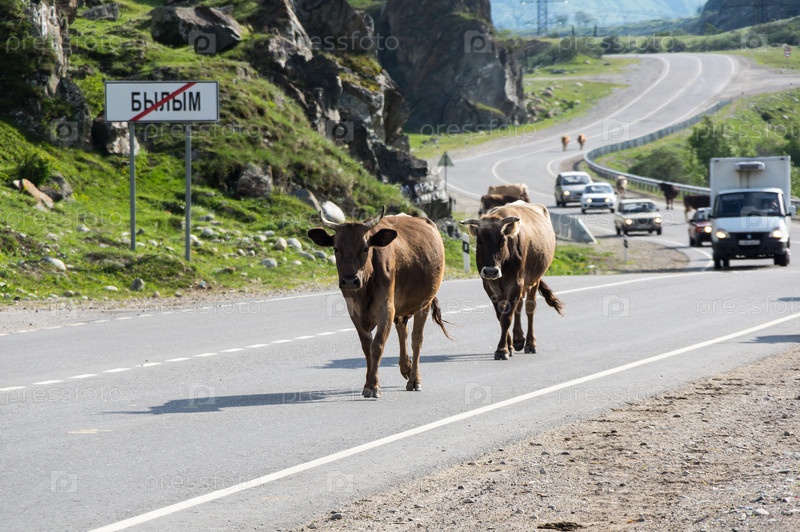 Стадо коров в ущелье Баксан в Кавказских горах России