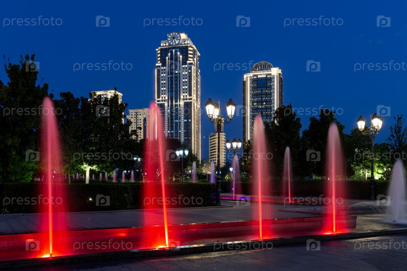Вид на освещенные фонтаны в парке перед современными небоскребами