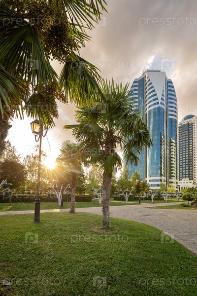 Зрительный закат тропических пальм в цветочном парке и Грозный-Сити, небоскребный комплекс в Грозном, расположенный в центре города, вдоль проспекта Ахмата Кадырова, Чеченская Республика, Северный Кавказ, Россия