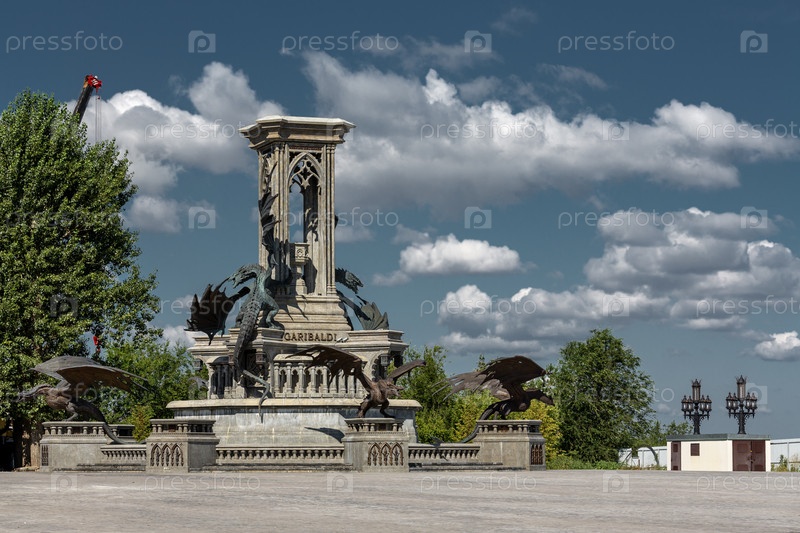 ГРЯШЧЕВКА ВЕЛИЖА, САМАРСКИЙ РЕГИОН, РФ - AUGUST 01, 2023: Панорамный вид на статуи драконов в замковом комплексе Гарибальди в солнечный летний день. популярное туристическое направление, достопримечательности и архитектура
