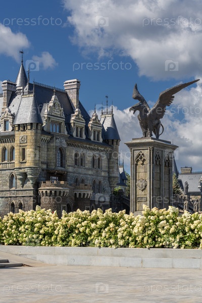 Вид на здание замка Гарибальди с цветами в переднем плане