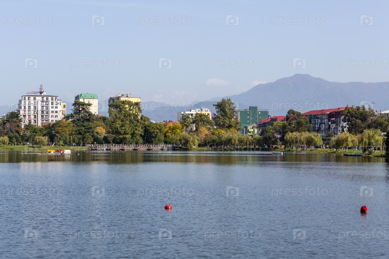 Вид на жилые здания возле озера в городском парке Батуми, Грузия