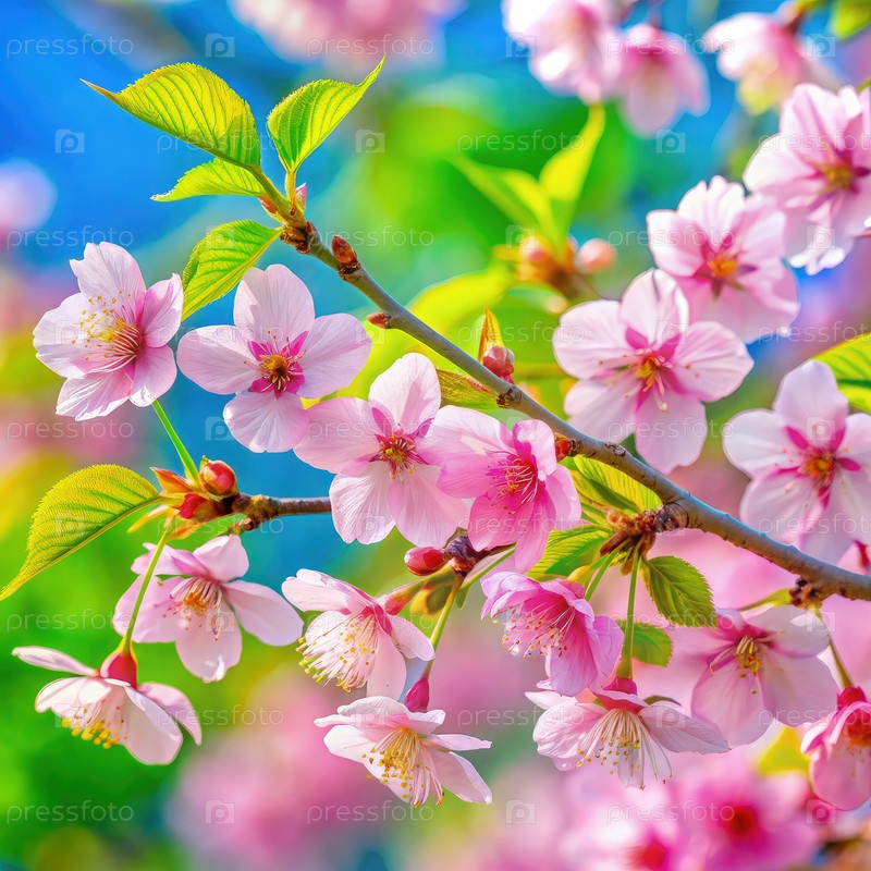 Деликатные розовые цветы сакуры в полном цветении весенним днем