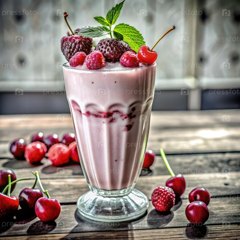 Освежающий малиновый и вишневый молочный коктейль на деревянном рустическом столе
