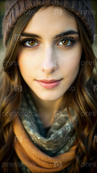 Близкий портрет молодой женщины в коричневой вязаной шляпе и шарфе