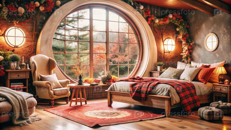 Уютная осенняя спальня с большим круглым окном и красным платовым одеялом
