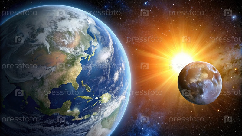Земля и Луна в космосе с солнечными лучами, освещающими сцену