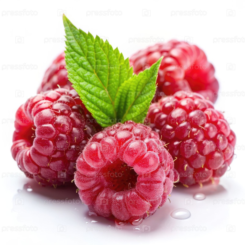 Ближайшее изображение спелых малин с капельками воды на белом фоне