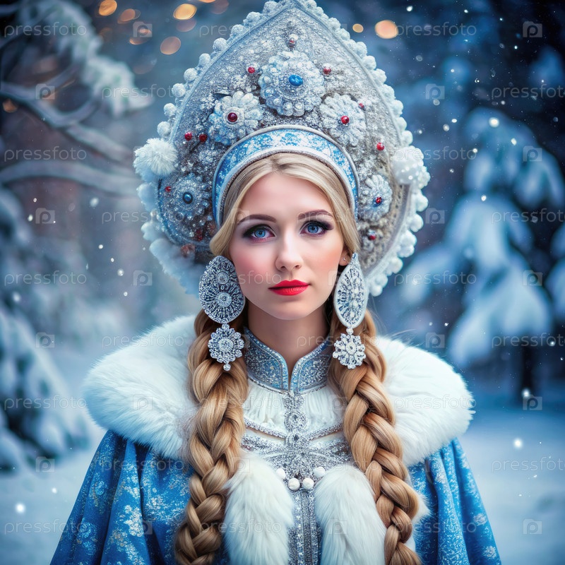 Молодая женщина в традиционном русском зимнем наряде в снежном лесу
