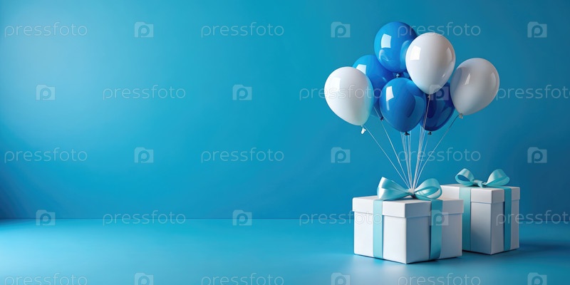 Белые коробки для подарков и голубые воздушные шары на синем фоне