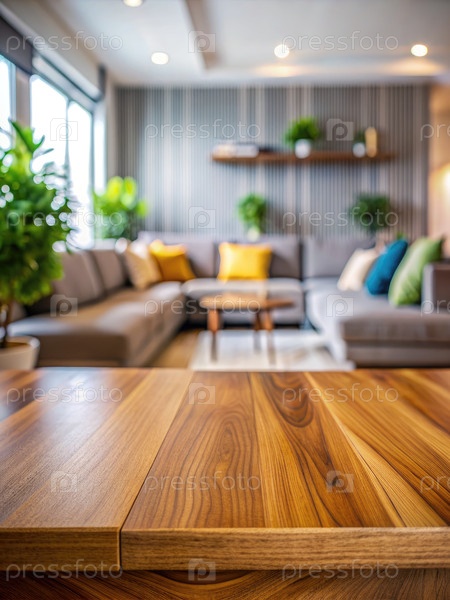 Гладкий деревянный столешничный стол с размытым фоном гостиной