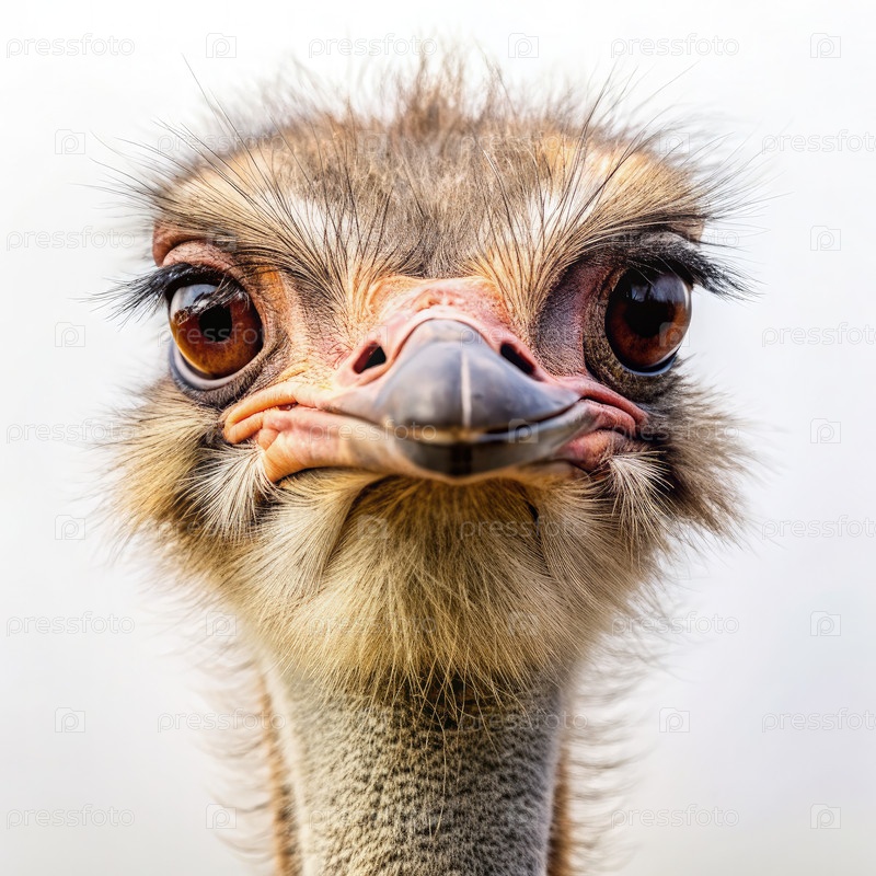 Близкий портрет страуса с любопытными глазами на белом фоне