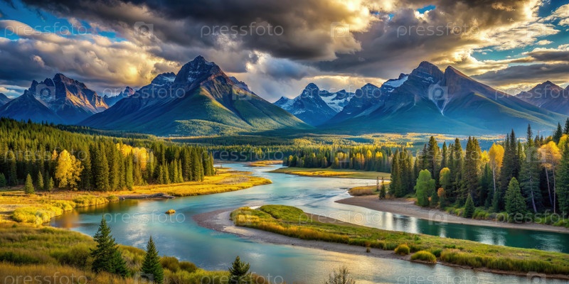 Величественный горный хребет и витящаяся река в золотом часовом свете