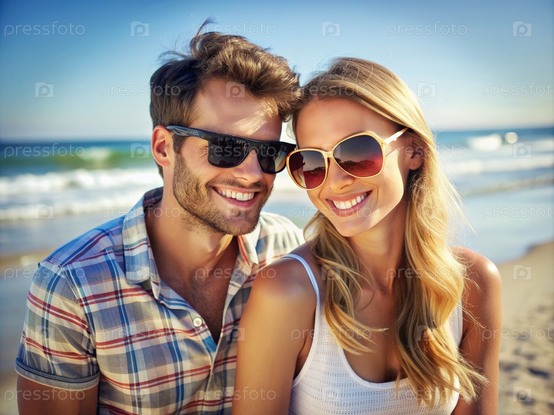 Счастливая пара, носящая солнцезащитные очки в солнечный пляжный день